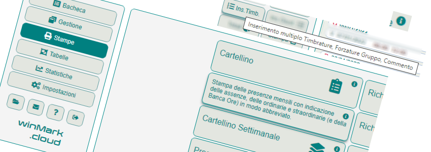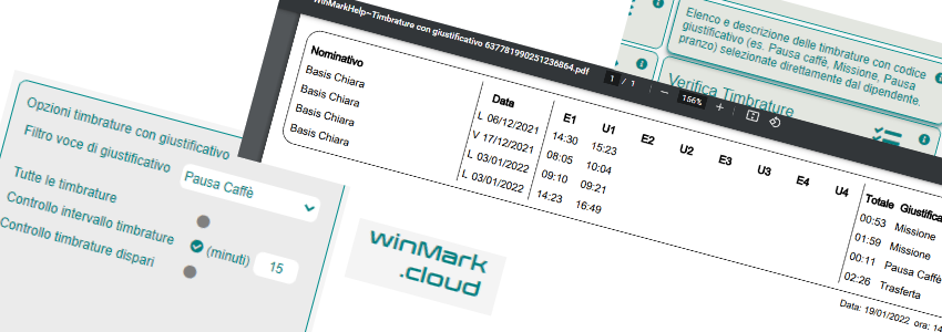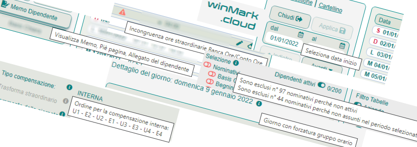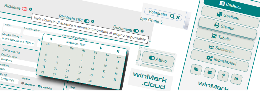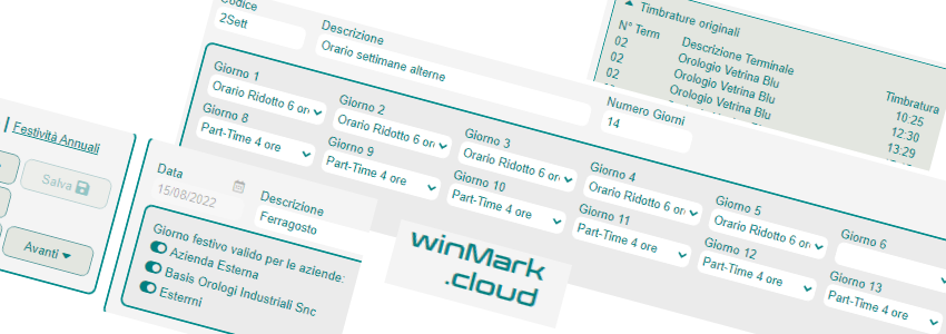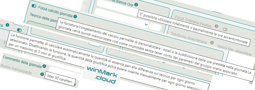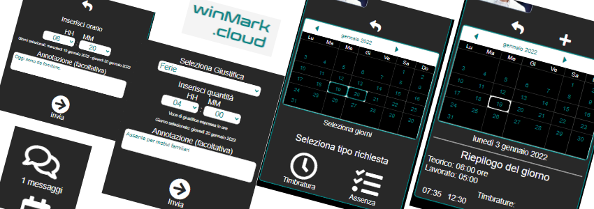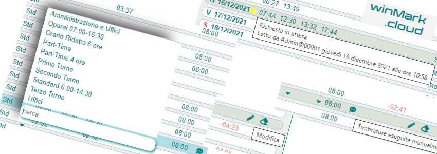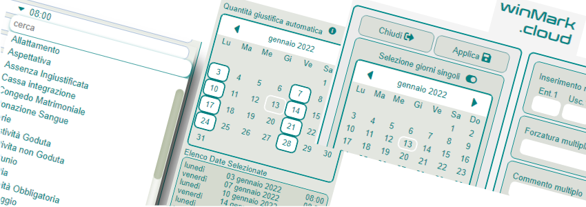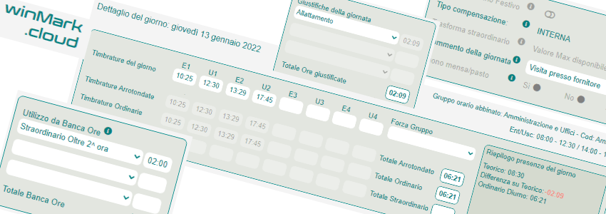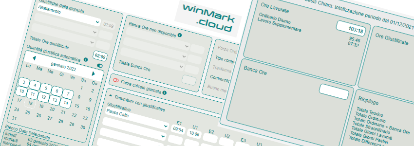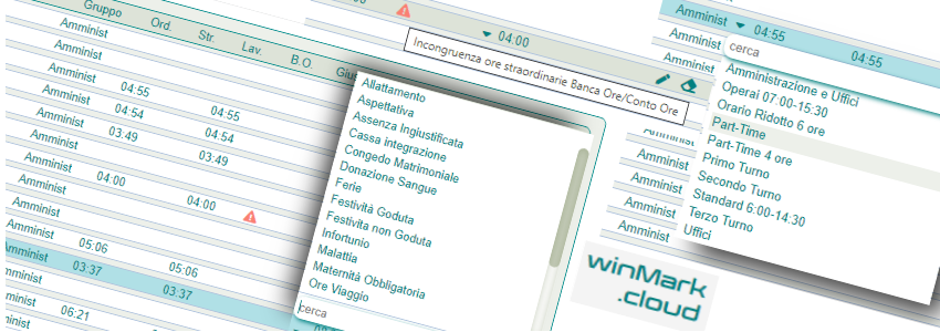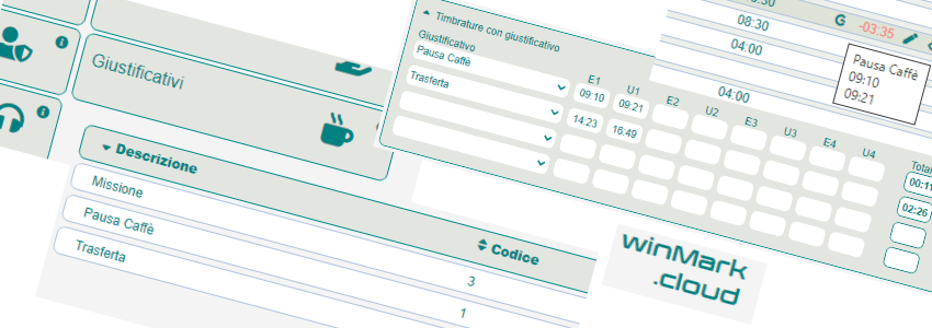 L'inserimento di una giustifica di assenza è gestito da un'interfaccia detta "" che permette di inserire qualsiasi voce di giustifica con semplice click. Il sistema è in grado automaticamente di attribuire, ad esempio "", per la quantità necessaria senza nessun’altra interazione. Un altro esempio di rapidità di gestione è il "": ciò permette di avere diversi orari di lavoro abbinati ai singoli dipendenti e winMark.cloud, senza alcuna operazione, riconoscerà in autonomia quale orario svolge ogni singolo giorno il dipendente, abbinando correttamente le maggiorazioni ed eventuali altri funzioni.