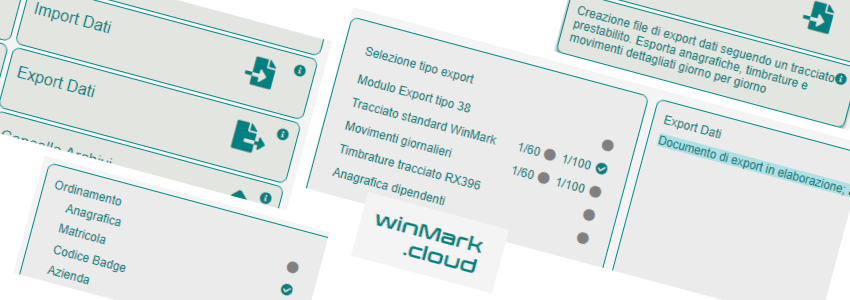 Contestualmente winMark.cloud è in grado di esportare tante altre informazioni. Le anagrafiche dei dipendenti per il riutilizzo in azienda, i movimenti giornalieri con tutti i dettagli di ogni singolo giorno e molto altro. Tutte queste esportazioni sono disponibili in tracciati su file (XLS) per una migliore compatibilità con altri sistemi di importazioni.