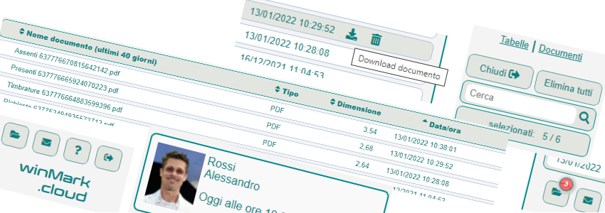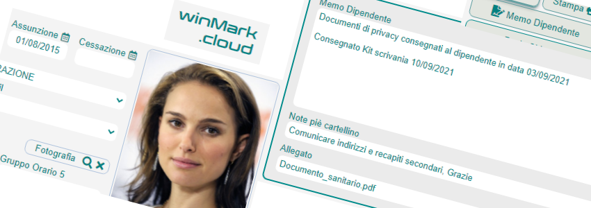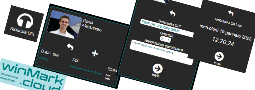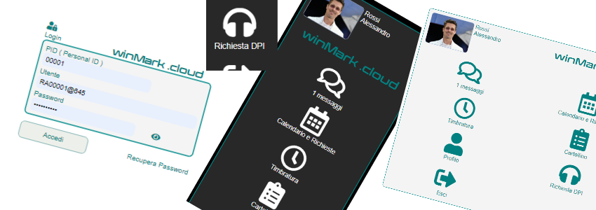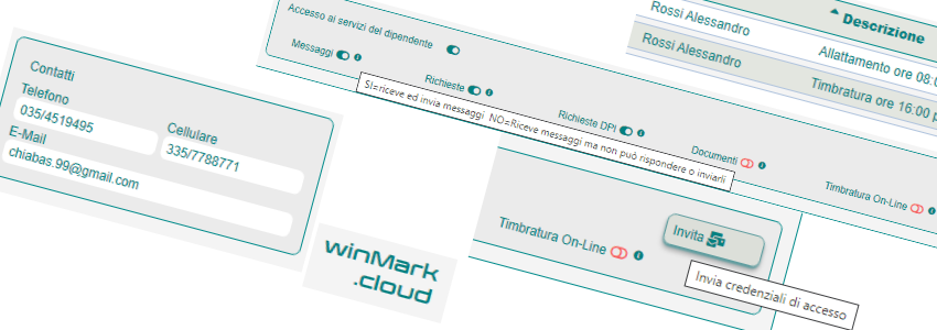 In modo particolare winMark.cloud è stato progettato per consentire l'utilizzo al dipendente, affinché egli possa accedere dal suo Smartphone o Tablet in mobilità, ovunque si trovi e quando vuole. Previa autorizzazione da parte del proprio responsabile, il dipendente può visualizzare il proprio cartellino, inviare e ricevere messaggi, richiedere assenze o mancate timbrature, richiedere DPI (Dispositivi di Protezione Individuale), timbrare direttamente da Smartphone.