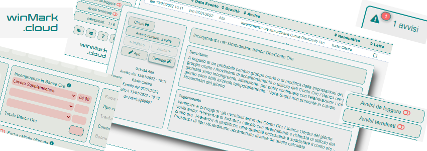 Con winMark.cloud hai tutto sotto controllo. Ricevi avvisi, messaggi e richieste in tempo reale e verifica quali non hai ancora visualizzato. Gli sono catalogati per priorità ed importanza: dai segnali dei terminali di timbratura off-line, errori di sistema, fino a incongruenze di calcolo qualsiasi altro segnale che necessiti di attenzione dell’utente di winMark.cloud.