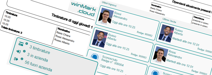 winMark.cloud riceve in tempo reale tutte le timbrature effettuate dai dipendenti dai terminali e grazie ad esse conosce in qualsiasi momento. Puoi vedere immediatamente dalla bacheca del portale gli ultimi ingressi e le ultime uscite. E verificare in ogni istante in modo semplice e veloce se un determinato dipendente è in azienda oppure no.
