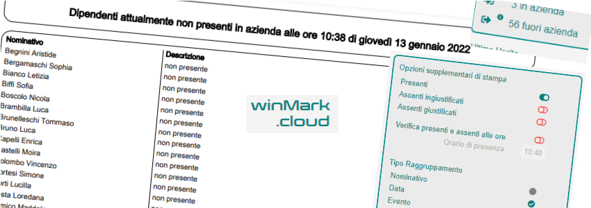 In caso di evento avverso in azienda e quindi in casi di evacuazione, winMark.cloud è in grado di elencare in tempi rapidissimi i dipendenti che sono in azienda, indicando l'ora di ingresso. Tutte le presenze e le assenze del giorno corrente o di periodi passati sono sottoponibili a per poter estrapolare al meglio le informazioni desiderate nell' desiderato.