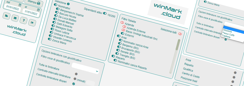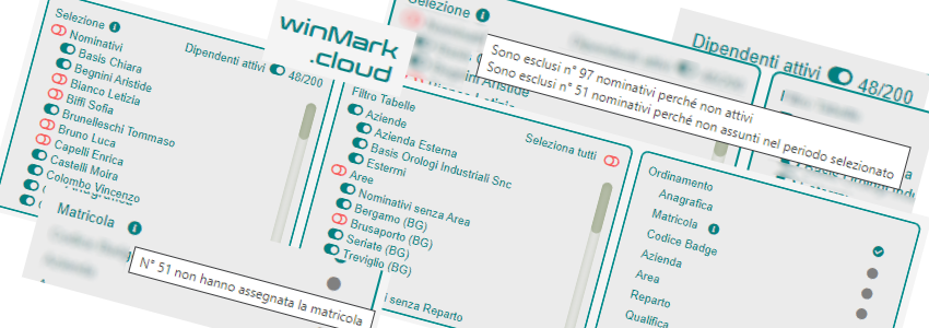Ogni estrazione, funzione, stampa, documento, ricerca di winMark.cloud ha a disposizione un ed curato e completo. Attraverso questi strumenti è possibile selezionare singoli dipendenti, gruppi dipendenti filtrati per tabelle: Aziende, Reparti, Aree, Centri di Costo, Qualifica, combinate tra loro o prese singolarmente. A questo filtro avanzato si aggiunge la possibilità di includere o escludere i dipendenti non più attivi all’interno della stampa. Il report generato può essere anche personalizzato stabilendo il tipo di ordinamento: per anagrafica, per codice di matricola, per reparto e tante altre opzioni.