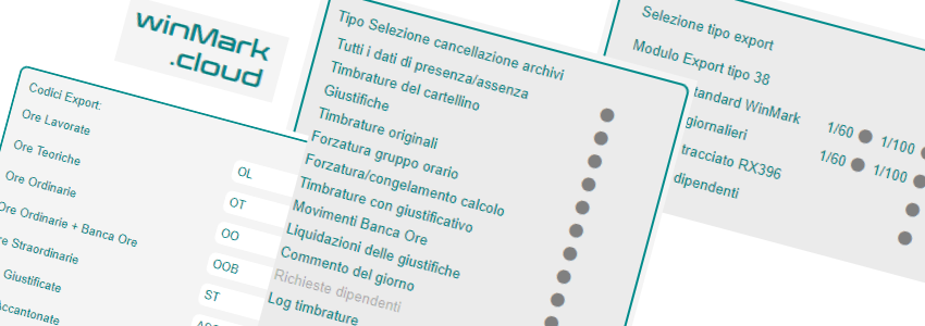 winMark.cloud possiede potenti funzioni di calcolo che permettono di ottenere risultanze molto simili ai cedolini paghe. Sono disponibili decine di verso paghe al fine di esportare i dati ottenuti con il sistema Web e quindi essere importati direttamente dai Software utilizzati dagli studi paghe, i quali dovranno produrre i cedolini dei dipendenti. Attualmente sono disponibili oltre 40 tracciati, tra cui i più diffusi come e tanti altri.