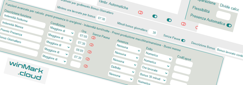 Le sue permettono di calcolare indennità, mansioni, premi presenza, ticket restaurant, bonus e tanto altro. È possibile attivare le timbrature automatiche e la presenza automatica, forzare criteri di calcolo per singoli giorni. Una delle funzioni più apprezzate è il riconoscimento dell'orario di lavoro in maniera del tutto autonoma, senza alcun intervento manuale. Infatti, winMark.cloud è in grado di riconoscere l'orario di lavoro assegnando automaticamente maggiorazioni ed effettuando totalizzazioni.